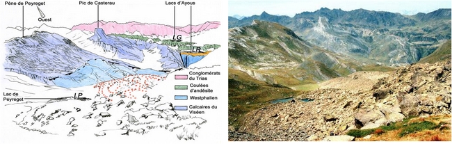 Manipulations, expérimentations, nous permettront de mieux comprendre le volcanisme du volcan d’Ossau. Nous profiterons de l’excursion pour analyser les conglomérats issus de l’érosion de la vieille chaîne des Pyrénées, la chaîne hercynienne. La chance nous guidera-t-elle vers ces spectaculaires fentes de dessiccation dans les vieilles argiles de 280 millions d’années. Pierres gravées et relief karstique seront de la partie. Photo prise vers l’ouest, depuis le col de Peyreget, et dessin d’interprétation(Source: Saga Information – N° 290 – Spécial Anniversaire – Octobre 2009) |