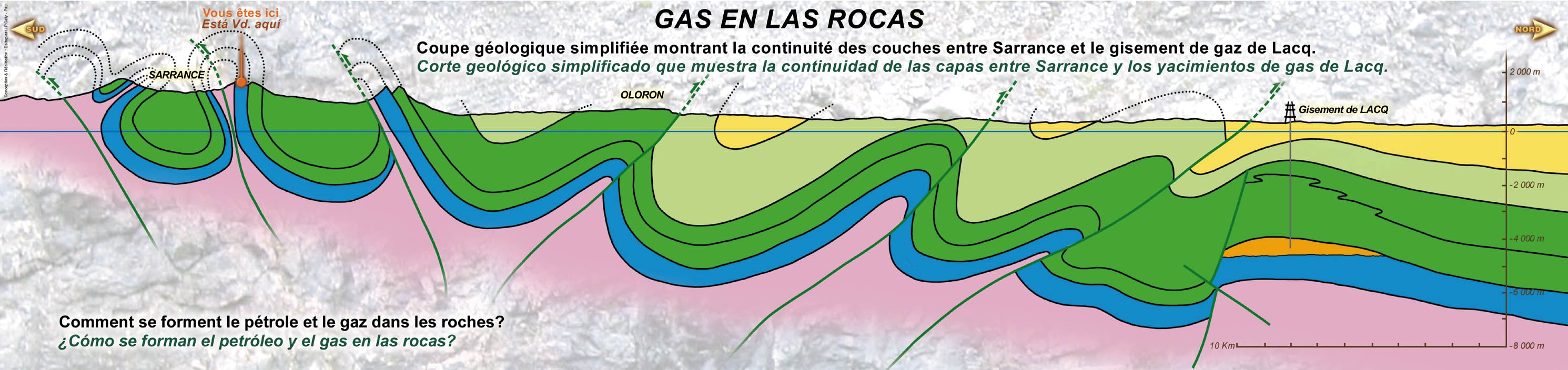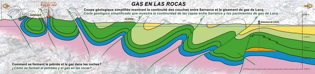 Marche à pied. Repas tiré du sac. Départ : 8h30 - Parking Auchan à Pau (à côté de la station essence). Les démarches du géologue de terrain seront abordées à l’aide de cartes topographiques, géologiques et des affleurements. On étudiera les modes de dépôt et la déformation des roches exposées dans l’anticlinal de Sarrance. ![]() Coupe géologique simplifiée entre le gisement de Lacq et Sarrance (Source: RGTP) |