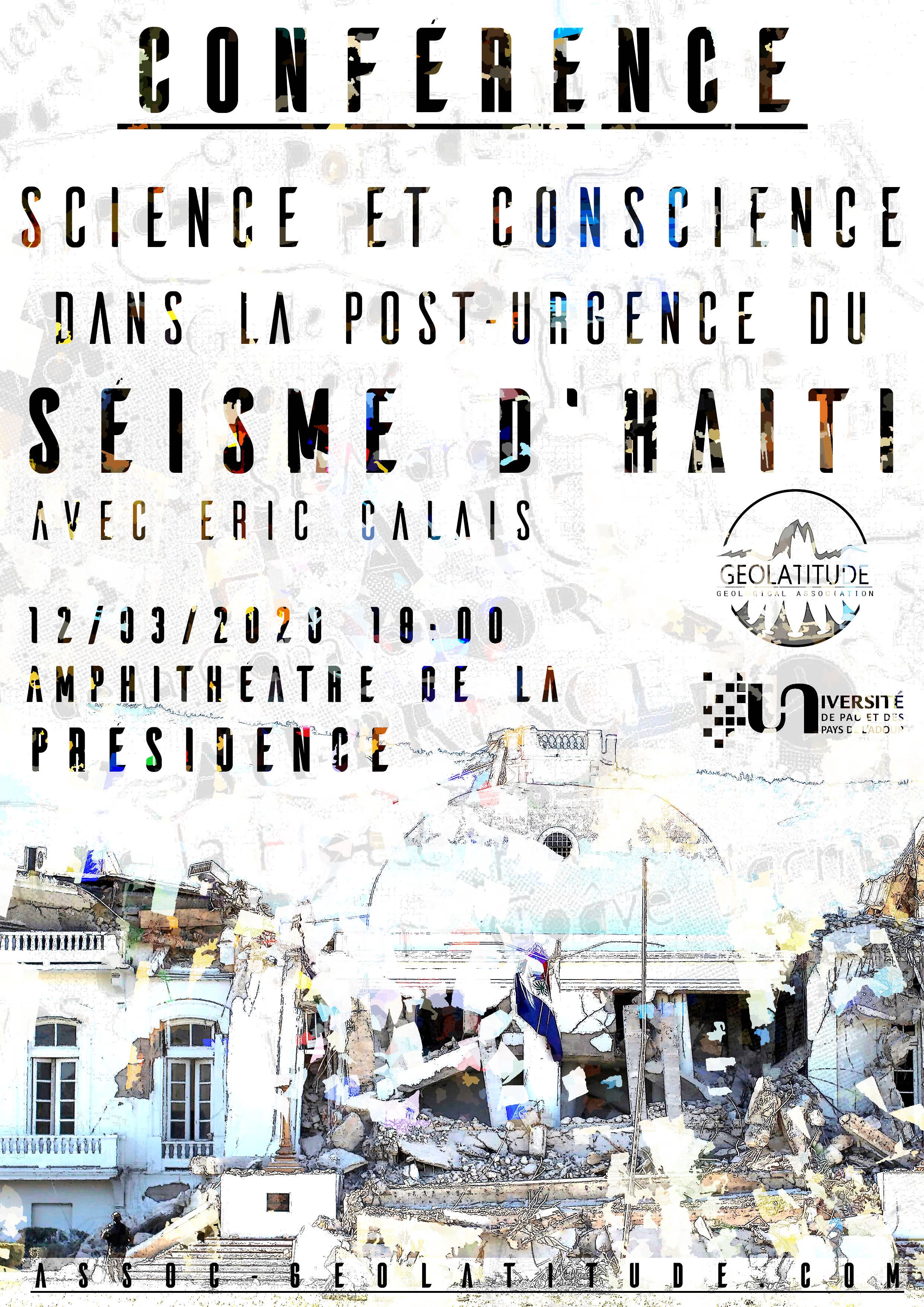 Le 12 mars à 18h à l'amphithéâtre de la Présidence (Université de Pau et des Pays de l'Adour), l'association Géolatitude organise une conférence avec le géologue Eric Calais, professeur à l'Ecole normale supérieure (Paris) et membre de l’Académie des Sciences et de l’Institut Universitaire de France sur le thème :"Science et conscience dans la post-urgence du séisme de 2010 en Haïti"