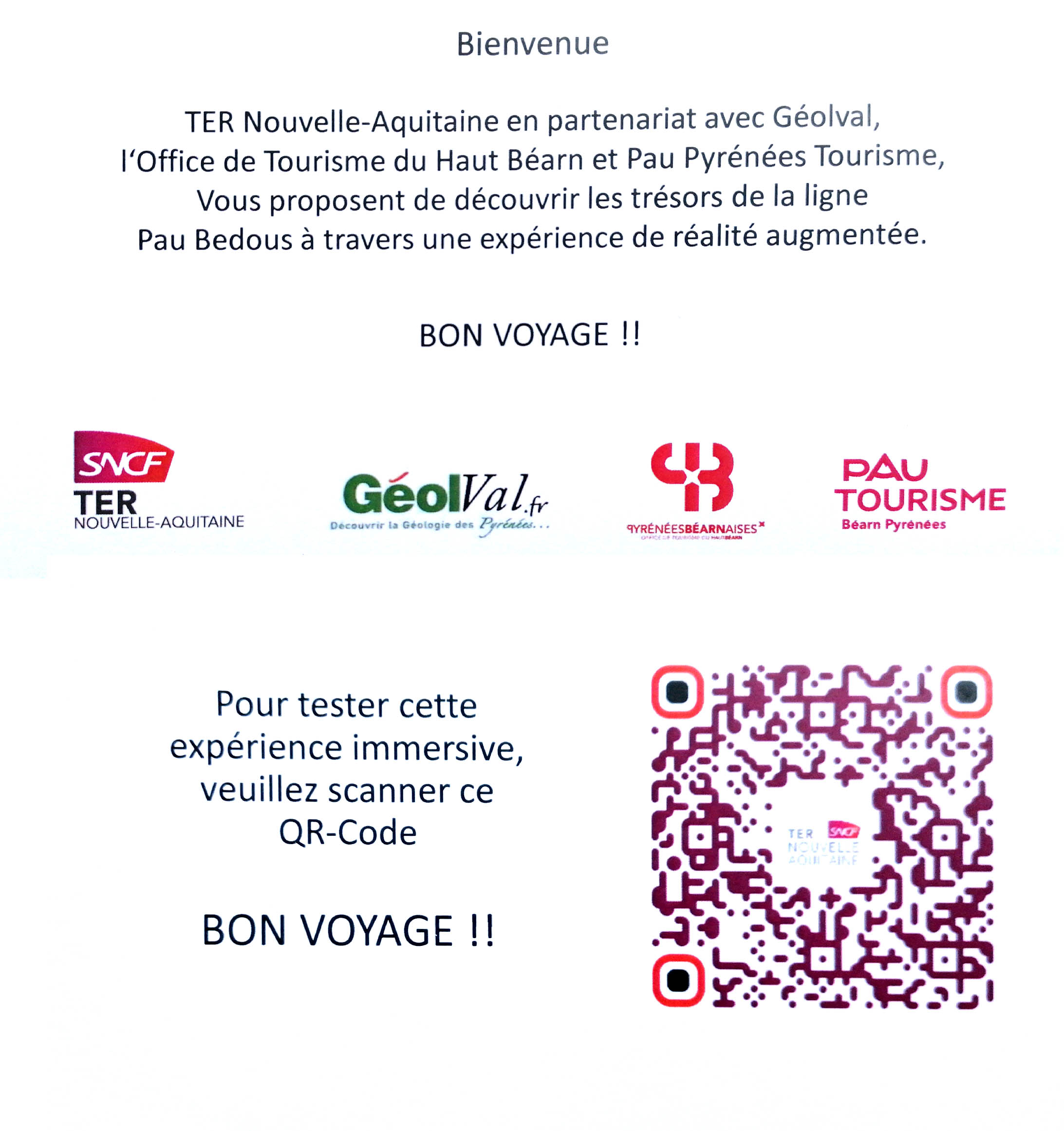 "SNCF TER Nouvelle-Aquitaine, l’association GéolVal, le Conseil Régional de Nouvelle-Aquitaine, les offices de tourisme du Haut Béarn, de Pau et de la Vallée d’Ossau se sont unis pour proposer au grand public le «GEOTRAIN», un produit estival qui associe le voyage en TER entre Pau et Bedous et une lecture géologique commentée, par un guide géologue, tout au long du trajet, des paysages et des richesses naturelles des coteaux, du Piémont jusqu’au coeur de la vallée d’Aspe." Le premier voyage, effectué le 8 juillet, embarquait une équipe de France 3 Pau sud Aquitaine qui a filmé l'évènement. Les prochaines dates sont les 20, 24, 27 juillet et les 3 et 7 août. Aller : Pau Gare 09h16/10h22 Bedous Gare