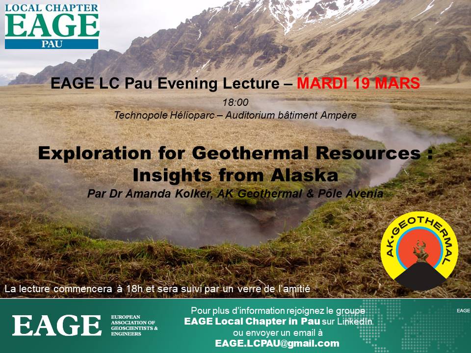 La section de l'EAGE (European Association of Geoscientists & engineers) à Pau tiendra le mardi 19 mars 2019 à 18h, à la Technopole Hélioparc – Auditorium bâtiment Ampère - une conférence sur le thème de l'exploration des ressources géothermiques en Alaska |