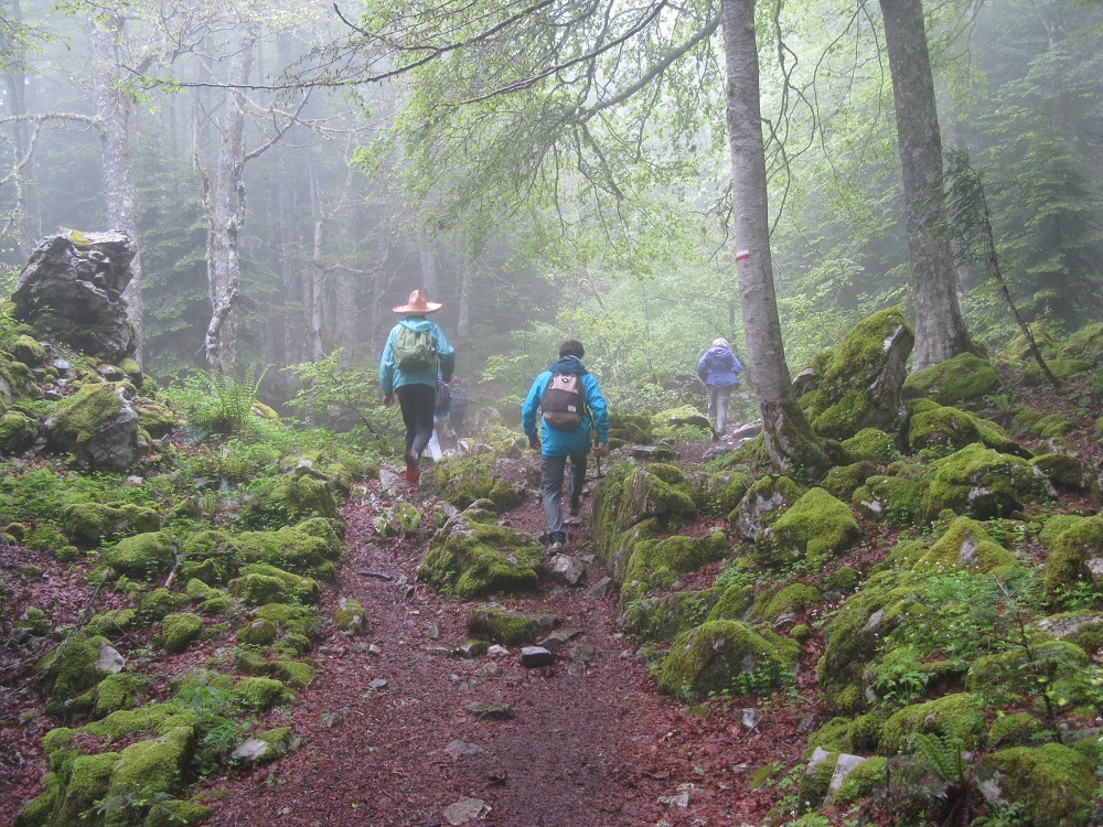 Pour la 3e fois les étudiants du lycée de Toulouse Auzeville viennent sur la RGTP puis montent en altitude en Aspe, pour découvrir la géologie à pied par le travail d’investigation sur le terrain. De Labérouat au Pas d’Azuns, professeurs, étudiants, accompagnateur en montagne et géologues de Géolval ont progressé, dans un brouillard tenace qui n’a laissé voir aucun des paysages de ce grand cirque glaciaire spectaculaire ! Ainsi, dans cette ambiance humide et fraiche mais toujours studieuse, puisque tectonique hercynienne/alpine et discordance ne pouvaient être lues dans les paysages, des thèmes inattendus ont pu être évoqués ou développés : l’analyse fine de certains affleurements, la recherche de fossiles pour un futur paléontologue, le pastoralisme et son impact sur les paysages et sur l’économie de la vallée, les notions d’aléas et de risques en zone de montagne, les questions complexes liées à la coexistence entre faune sauvage et développement des activités touristiques en zone de montagne, et même les tiques ! Bref, une journée rafraichissante et stimulante pour tous ! Merci aux étudiants pour leur curiosité, leur dynamisme et leur résilience ! AL -BK |