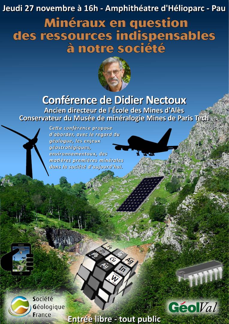 Conférence de la SGF : Didier Nectoux tiendra une conférence "Minéraux en question : des ressources indispensables à notre société" le jeudi 27 novembre 2025 à 16h à l'amphithéâtre d'Hélioparc, 2 Av. du Président Pierre Angot, 64000 Pau. |