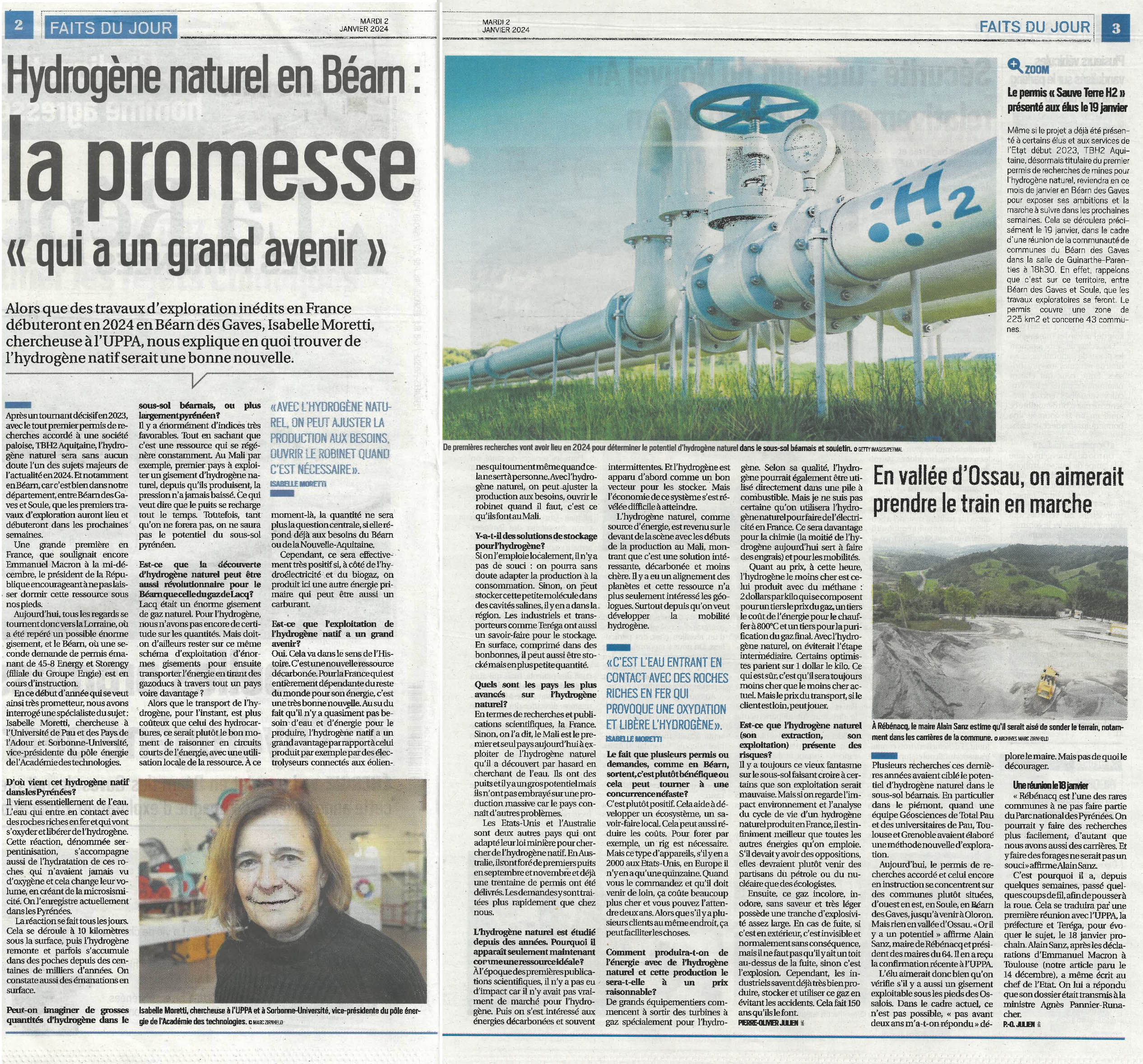 "Des études de terrain préliminaires avaient confirmé le potentiel du secteur. "À proximité des Pyrénées, l'hydrogène vient de l'interaction eau/roche" dans le sous-sol, explique Isabelle Moretti, chercheuse à l'université de Pau et des Pays de l'Adour."